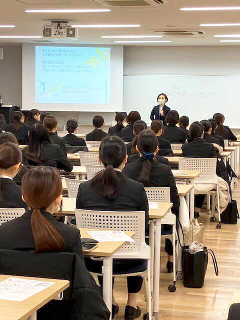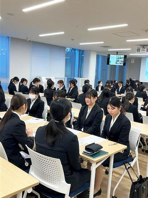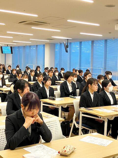 また当日は、全員がスーツを着用して参加し、身だしなみや立ち居振る舞いなど、教室の中にいながらも"本番に近い空気"を感じる時間となりました。就職活動がいよいよ始まるという意識を高める機会にもつながっています。