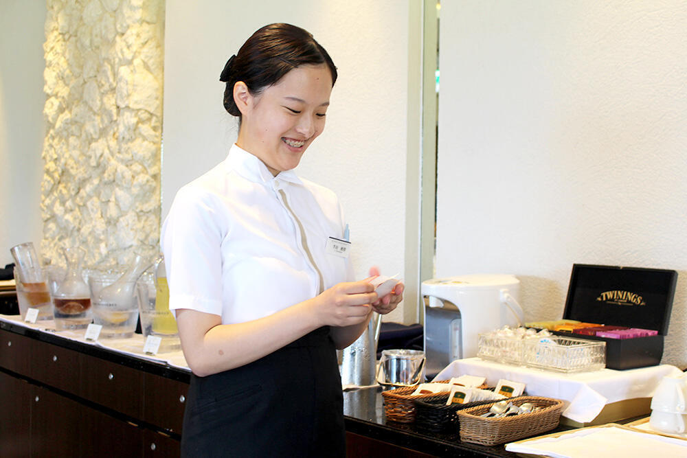- 料飲部門では朝食ビュッフェに入り、お客さまと会話をしながらサービスを行う機会をいただきました。お客さま一人ひとりの状況に合わせた対応の大切さを学ぶとともに、直接「ありがとう」と声をかけていただける喜びを感じることができました。