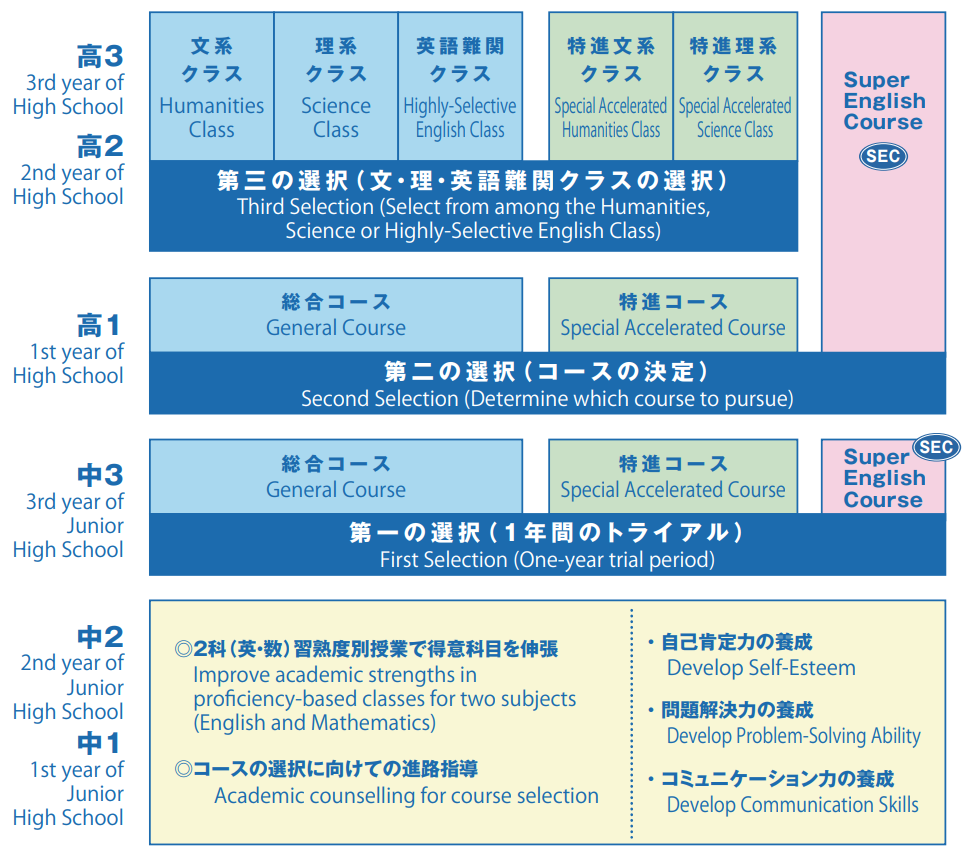 Students entering Mejiro Kenshin High School may select from one of three courses of study: the "Special Accelerated Course" for those students seeking admission to highly-selective public or private universities,"Super English Course" for students aiming to study at an overseas university or at a Japanese university offering world-class education and research or "General Course" which emphasizes a balance between preparation for higher education and club activities. Students starting at Mejiro Kenshin Junior High School may tentatively select one of the aforementioned courses during their third year, then make their final choice when beginning their first year of high school.