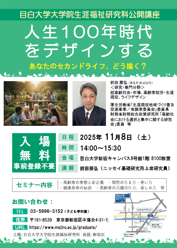 目白大学大学院生涯福祉研究科の公開講座は、「人生100年時代をデザインする」をテーマに、あなたのセカンドライフの描き方を考えるものです 。厚生労働省や財務省の研究会で委員長や委員など公的役職を歴任し 、超高齢社会の専門家として知られるニッセイ基礎研究所上席研究員の前田展弘氏を講師に迎え、以下の内容について語ります。