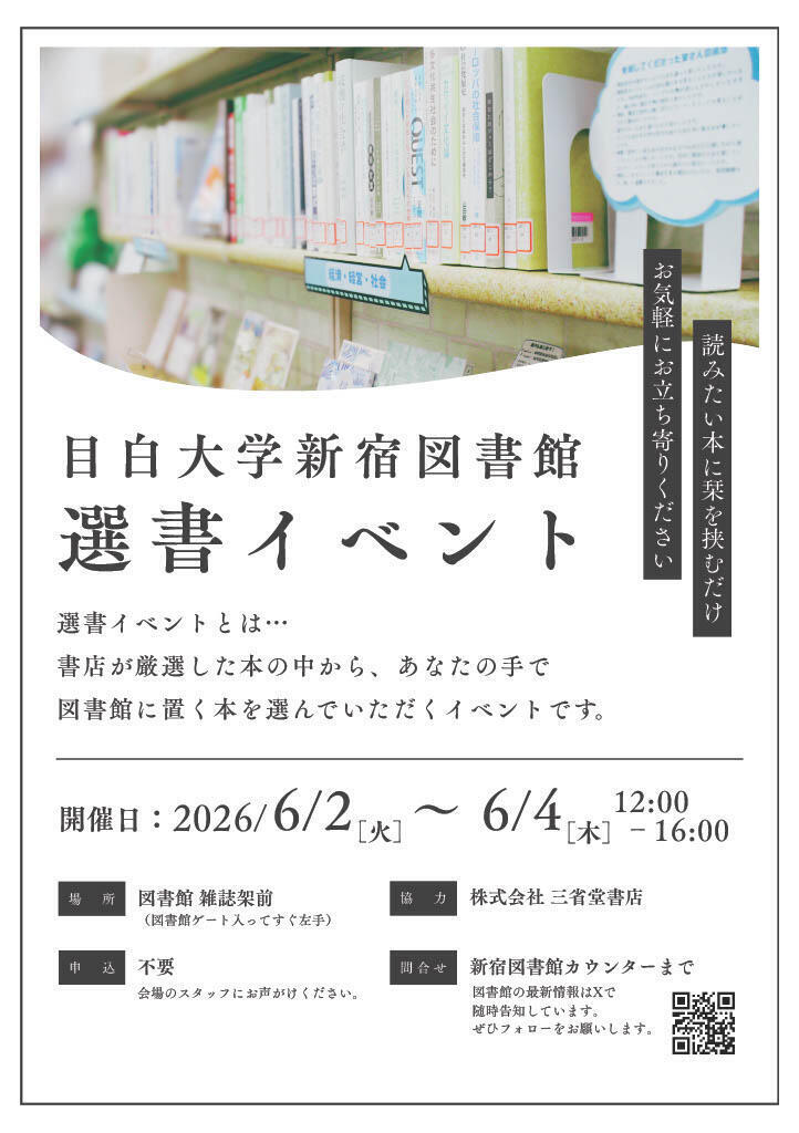 会 場:目白大学新宿図書館 本館1階 雑誌架前(図書館入りすぐ左手)