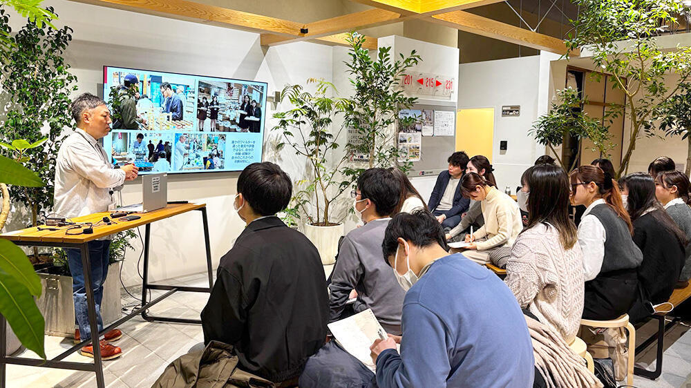 最終日は株式会社メンバーズ本社を訪問し、会社見学を経たのち、成果発表を行いました。4グループのテーマは、「推し活×無印良品~無印良品のFWを参考に~」、「未来への分岐点 無印良品有明店が創る「脱出アトラクション」型店舗」、「めぐりのパートナー-生産者と消費者をつなぐには-」、「つなぐを実験、MUJIラボ」であり、具体的な未来像を描き、それを実現させるための根拠に基づく解決策を挙げ、無印良品に援用する具体策を提案しました。学科が異なるメンバー構成の中、想像から創造へとアイデアを形にできたことは、今後受講生の力になっていくことと思います。