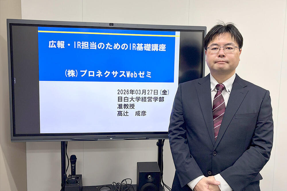 3月27日(金)、経営学部経営学科の髙辻成彦准教授が、上場企業・株式会社プロネクサスが 主催するIR(投資家向け広報)関連の講座「広報・IR担当のためのIR基礎講座」を実施し、 社会人向けに講演を行いました。