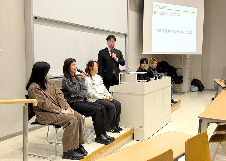 第14回講義では、経営学科4年生の内定者5人が登壇し、就職活動の取り組み状況についてQ&A形式で語りました。ファシリテーターは、担当教員の髙辻成彦准教授が務めました。