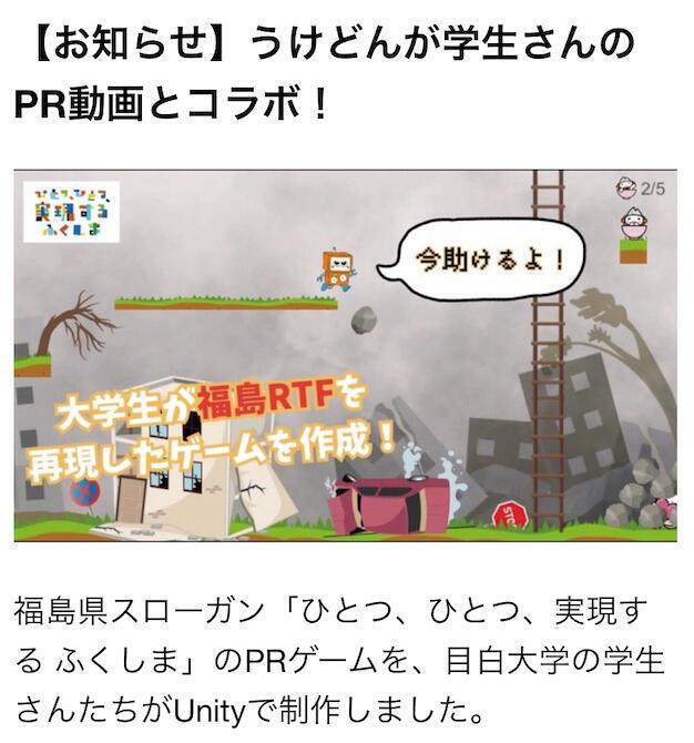福島県スローガン「ひとつ、ひとつ、実現する ふくしま」のPRゲームを、目白大学の学生さんたちがUnityで制作しました。