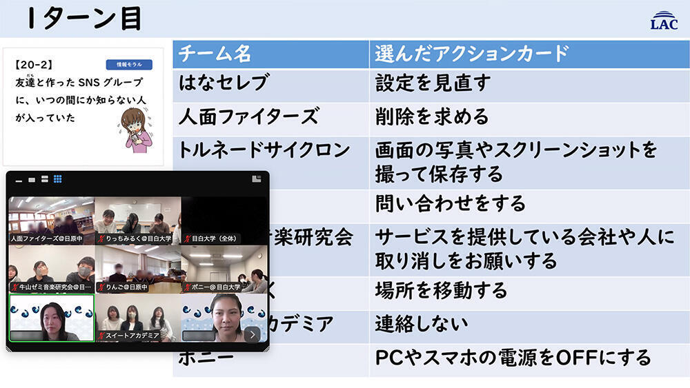 今回は、そのコンセプトを活かして、異なる世代や地域の考え方を知り、メディアと地域をつなげるゼミ活動に向けて視野を広げる機会とすることを目的に、株式会社ラックが開発した情報リテラシーカードゲーム「リテらっこ」を使って中学生との交流を行いました。