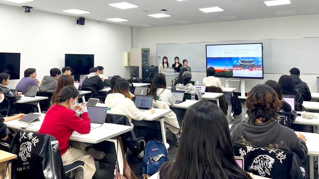 研修中は、日本語や日本語教育に関する授業を見学し、実際の教育現場を体験しました。また、現地で日本語を学ぶ学生たちへの個別レッスンを担当し、日本語や日本文化を伝える経験を積んだほか、韓国文化に触れることができました。