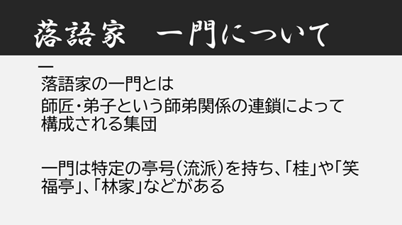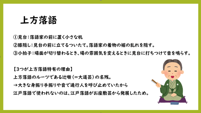 事前学習として、「寄席」とはどのような場所なのか、「落語の道具」には何があるのかを写真で確認しました。また、話の構成や上方落語と江戸落語の違いを調べたり、落語家の一門にはどんな集団があるかを調査したりしました。さらに、落語の歴史についても学びました。