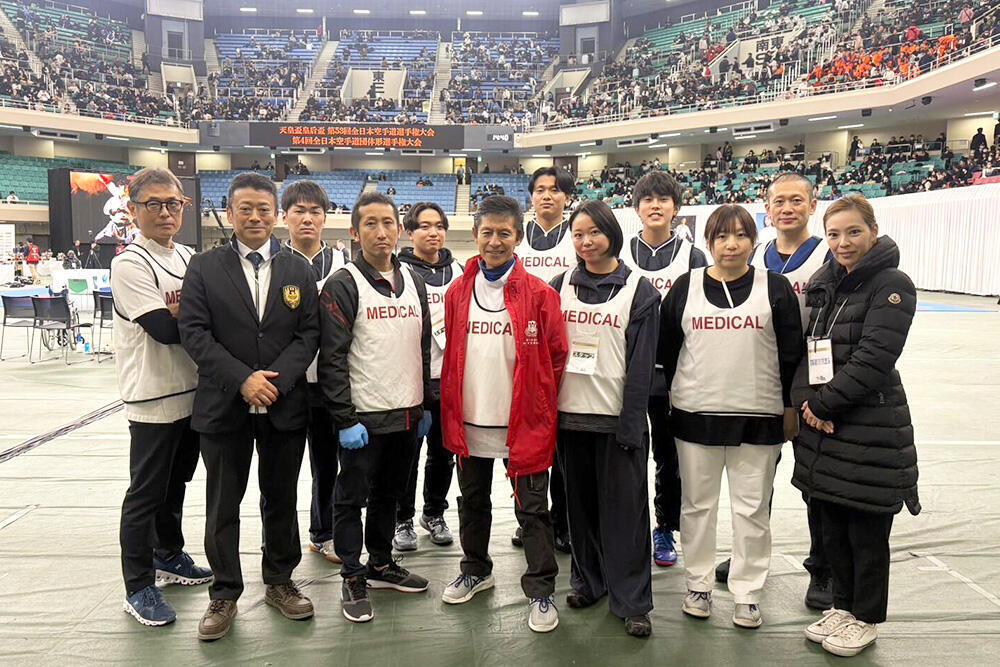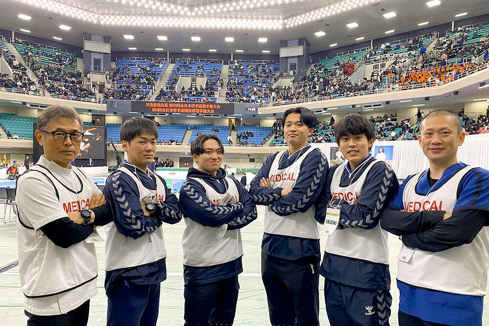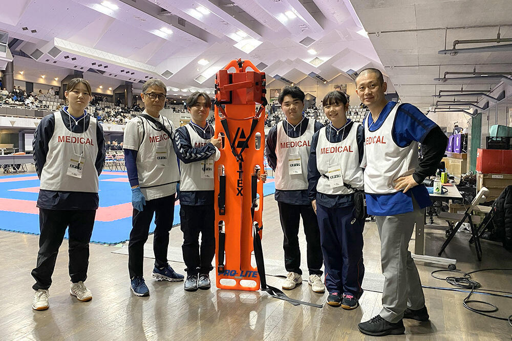 この大会には、全日本空手道連盟強化委員(医科学担当)でナショナルチームトレーナーを務める理学療法学科の工藤裕仁教授が大会救護トレーナーとして参加し、その指導下でスポーツサポーティング研究部に所属する理学療法学科の学生も救護担当として参加しました。