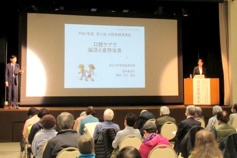 2月24日(火)、荒川区民会館(サンパール荒川)にて、理学療法学科の万行里佳教授が区民を対象とした「令和7年度 荒川区 口腔保健講演会」の講師として、約2時間の講演を行いました。