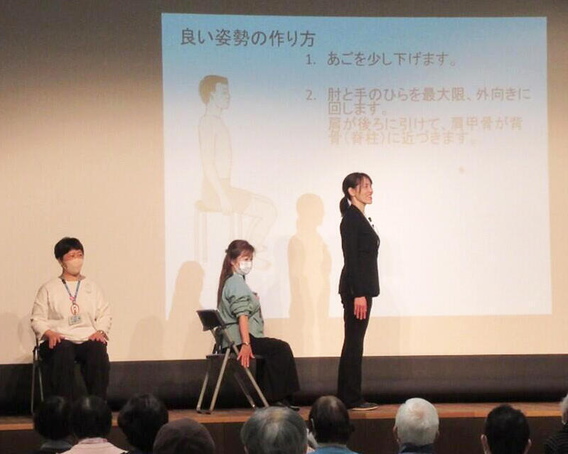 今回の講演内容は「口腔ケアで脳活と姿勢改善」でした。講演では、理学療法士の立場から、嚥下や転倒予防のための姿勢改善について解説しました。また、飲み込みに必要な筋肉のトレーニングなどを参加者と共に実践しました。