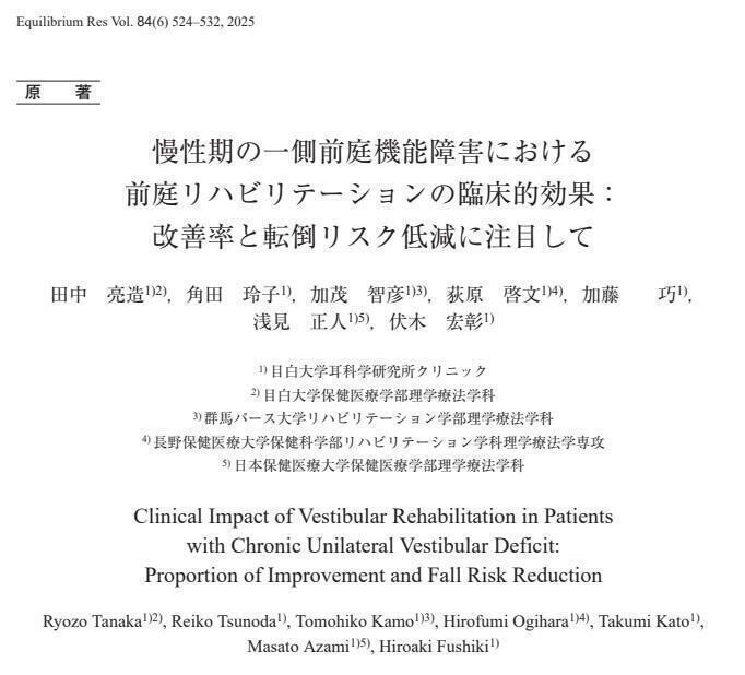 - 論 文 名 :『慢性期の一側前庭機能障害における前庭リハビリテーションの臨床的効果:改善率と転倒リスク低減に注目して』