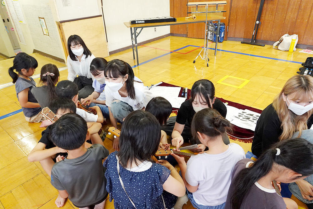 はじめに、ウクレレで『メリーさんのひつじ』を演奏し、その後に子どもたちにウクレレ体験の時間を設け、子どもたちと一緒に『かえるのうた』を演奏しました。