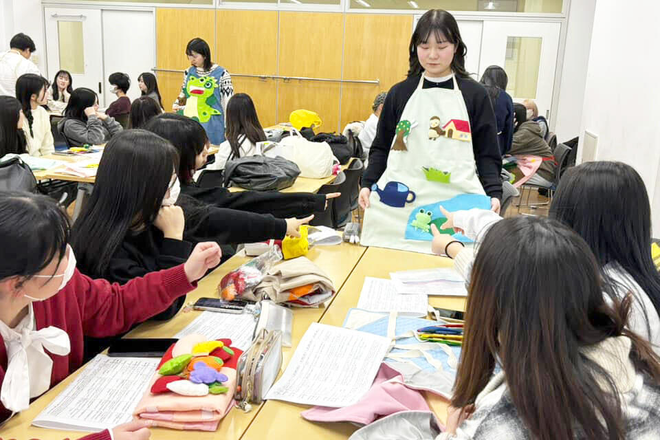 人間学部子ども学科の2年次科目「乳児保育演習」では、3歳未満児の健やかな成長発達支援について、実践を通して考えることを目的として、エプロンシアターの発表会を開催しています。エプロンシアターは、子どもが遊びを通して楽しみながら、言葉や感性、創造性、社会性等の獲得に向けて働きかける教材の1つです。