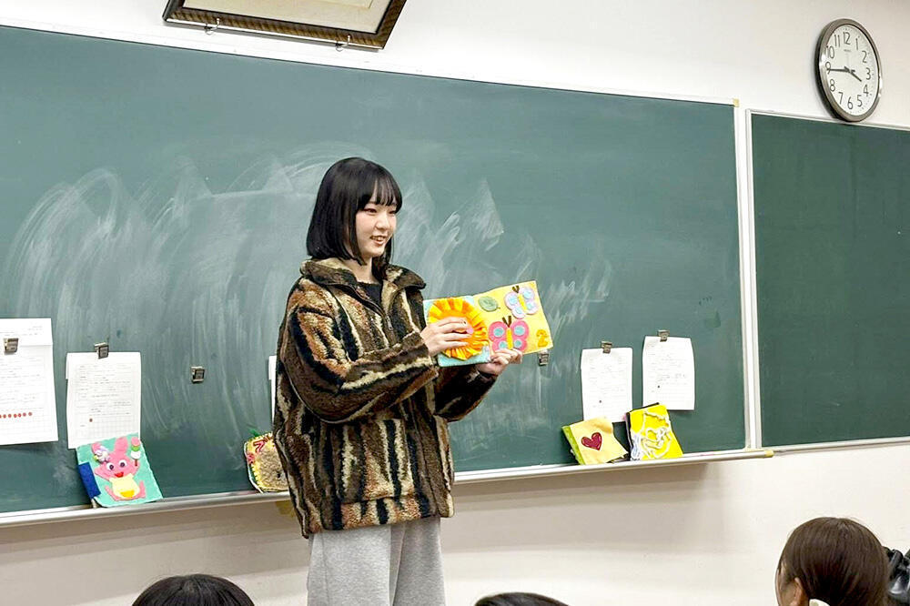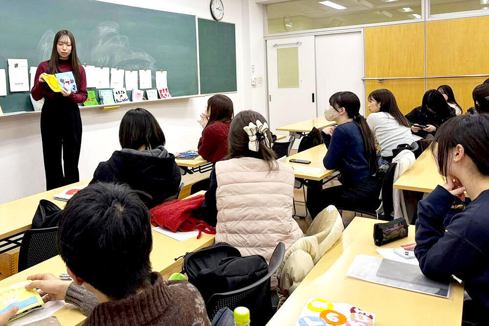 品評会では、教員による布絵本の紹介した後、学生が実際に作品に触れながら鑑賞しました。学生は子どもの視点に立ち、操作性や楽しさ、安全性などを意識しながら作品を見比べ、学びを深めました。鑑賞後には投票を行い、選ばれた作品については、制作の工夫点やねらい、子どもにどのような力が育まれるか、またどのように楽しめるかについて発表し、全体で共有しました。