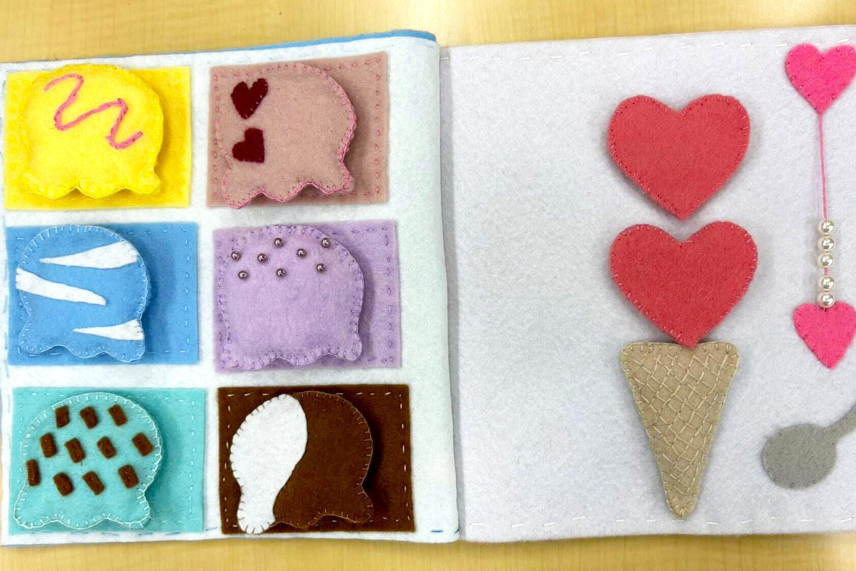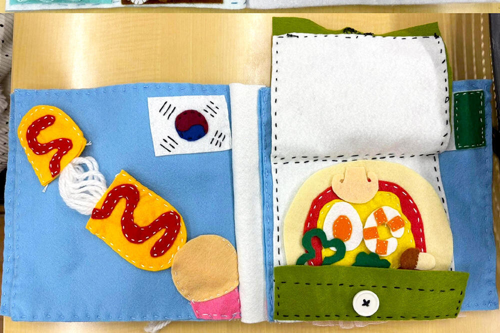 布絵本は、子どもが手指を使って操作しながら楽しむことができる教材であり、基本的生活習慣の自立に向けた援助や手の微細運動の発達、言語や数への気づき、さらに大人や他児とのやり取りを通したコミュニケーションや社会性の育ちを支える役割を持っています。本科目では、このような布絵本の特性を踏まえ、対象年齢や発達段階を意識した内容や構成を考えながら制作を行いました。
