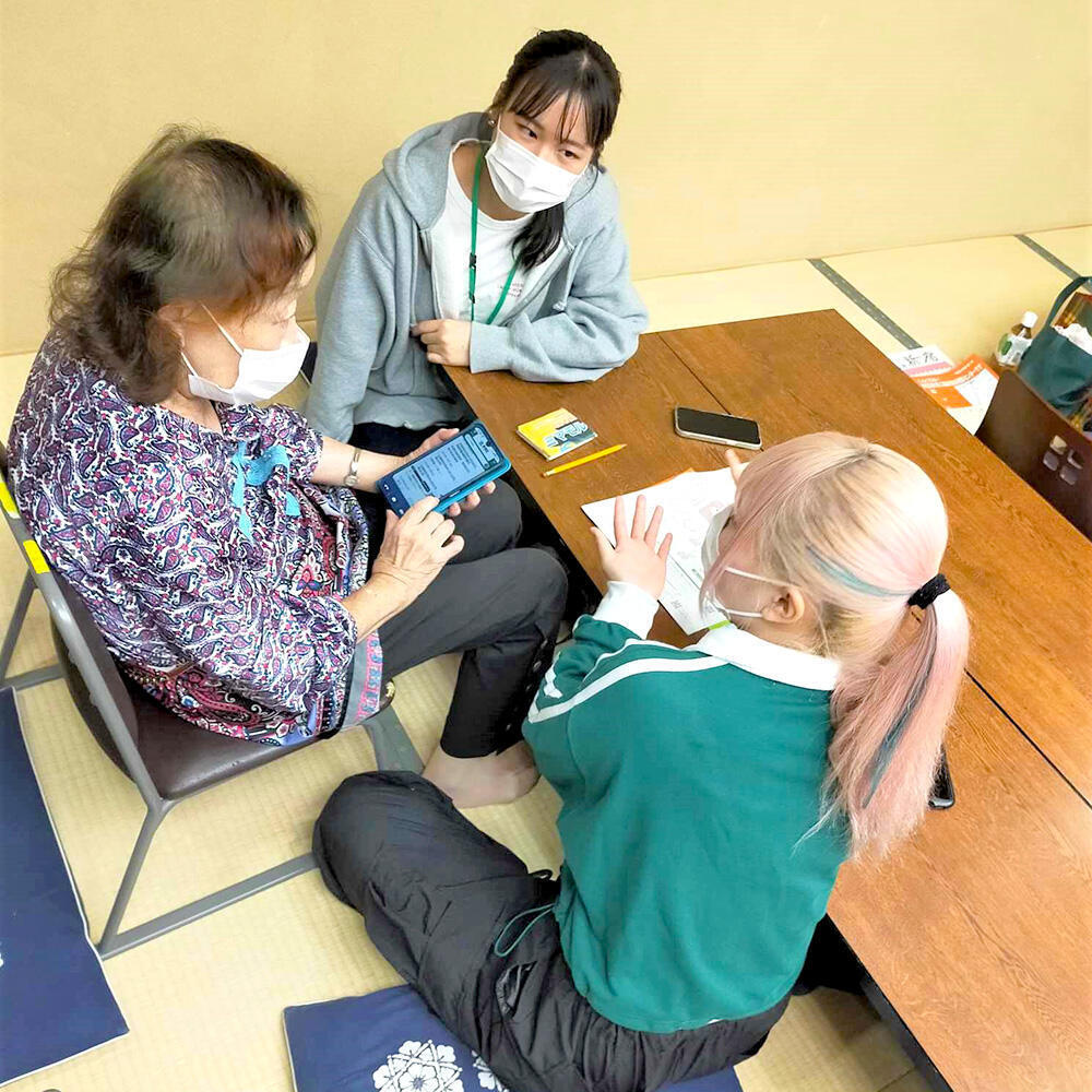 この講座は、地域の高齢者の皆さんのスマホ操作の悩みや疑問に学生がマンツーマンで対応し、一緒に楽しむことを目的としています。参加者の皆さんと学生たちはすぐに仲良くなり、講座は笑顔で和気あいあいとしたよい雰囲気で行われました。