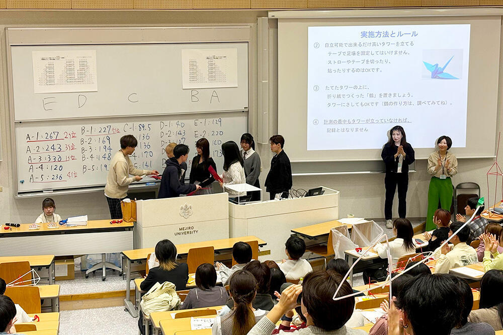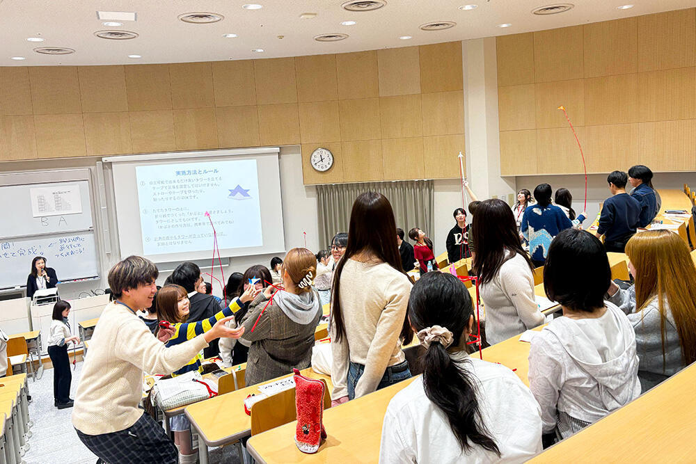 午前中のワークの1つとして、ストローを使ってグループ間で高さを競う「ストローチャレンジ」を行いました。一番上に折り紙で作った兜や鶴を載せて完成です。制限時間数分で、打ち合わせから仕上げまで行わなければなりません。各グループが目指す作品の完成に向けて、学生達の団結力と実行力が試されました。