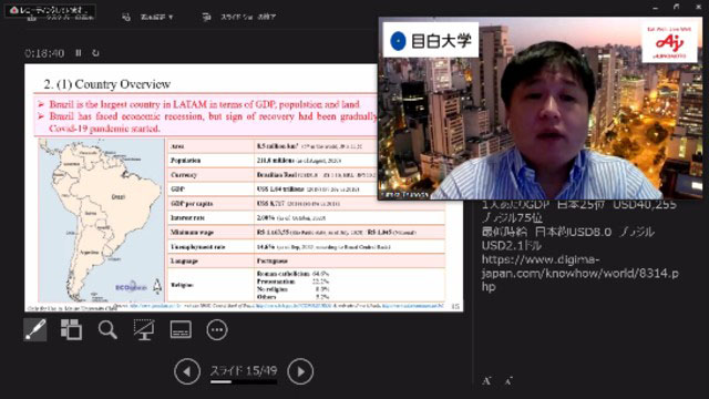 学生たちには、事前に味の素の海外事業が紹介された動画を視聴してから授業に臨むよう伝えました。当日の講義では、ブラジルの国土の広さや所得、最低賃金、国民性、小売店の陳列方法などについて、日本と比較しながら説明いただきました。