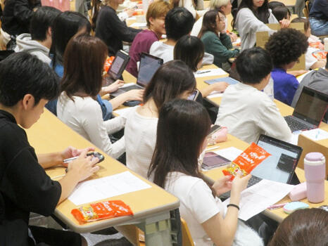 社会学部社会情報学科の「現代の社会2(フードブランド・ケーススタディ)」は、食品業界で活躍する実務家を招き、実際のマーケティング戦略についてお話しいただく講義型の授業です。