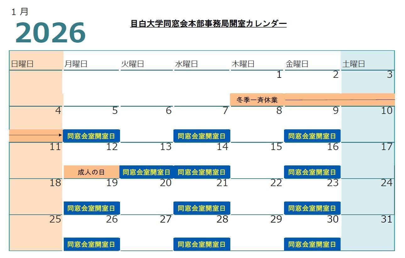 2026年1月の同窓会室の開室日についてお知らせいたします。