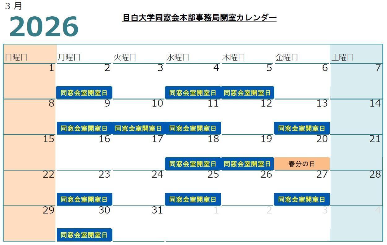 2026年3月の同窓会室の開室日についてお知らせいたします。