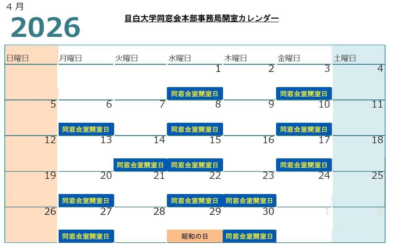 2026年4月の同窓会室の開室日についてお知らせいたします。