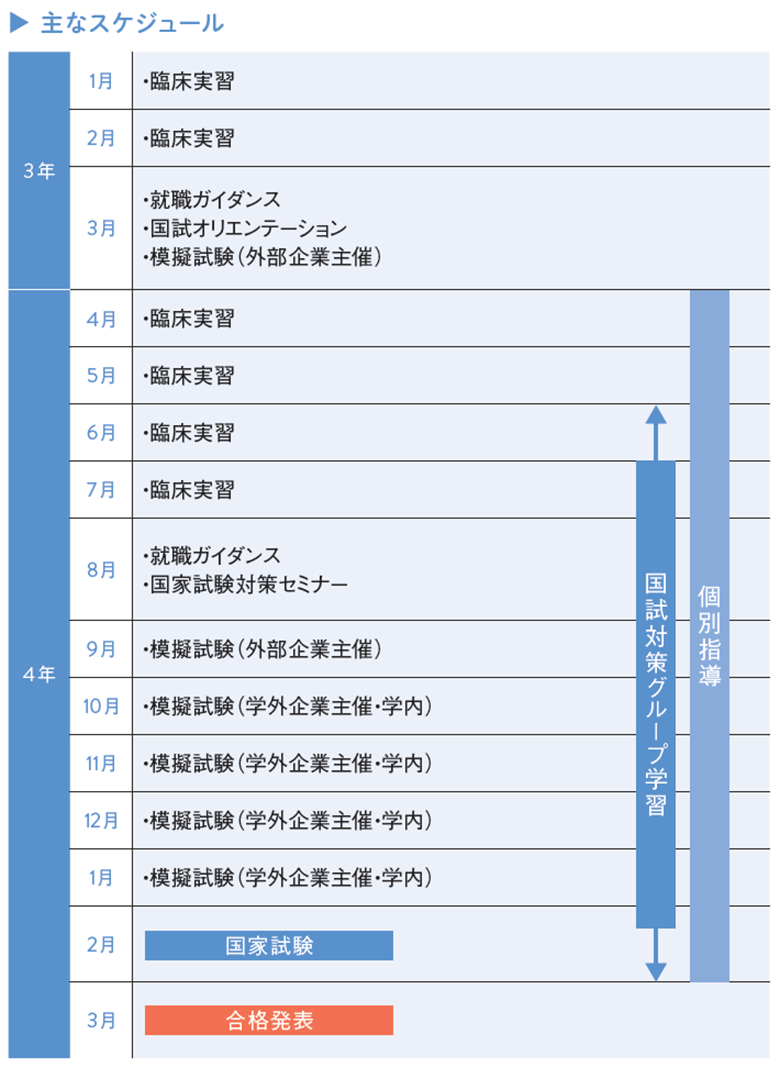 繰り返しの模擬試験と3年次からのゼミ指導で苦手を徹底的に克服早期から国家試験の勉強に集中できるよう、実習時期を配慮しているのが大きな特徴です。また、ゼミの担当教員による個別指導とグループ指導の繰り返しで確実な知識を身につけられる上、模擬試験を20 回以上実施し、結果に応じた課題に取り組むことで、苦手な分野を徹底的に克服。教員は学習面だけでなく、勉強中心の生活へ徐々にシフトできるように生活面の指導も行います。
