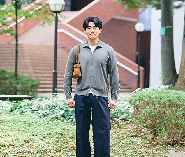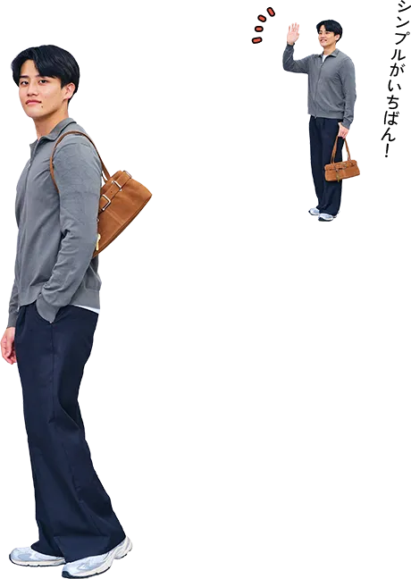 ジップアップニット+スラックスのようなシンプルなスタイルが多いけど、どこかに自分らしいアクセントを入れるのが好みです。