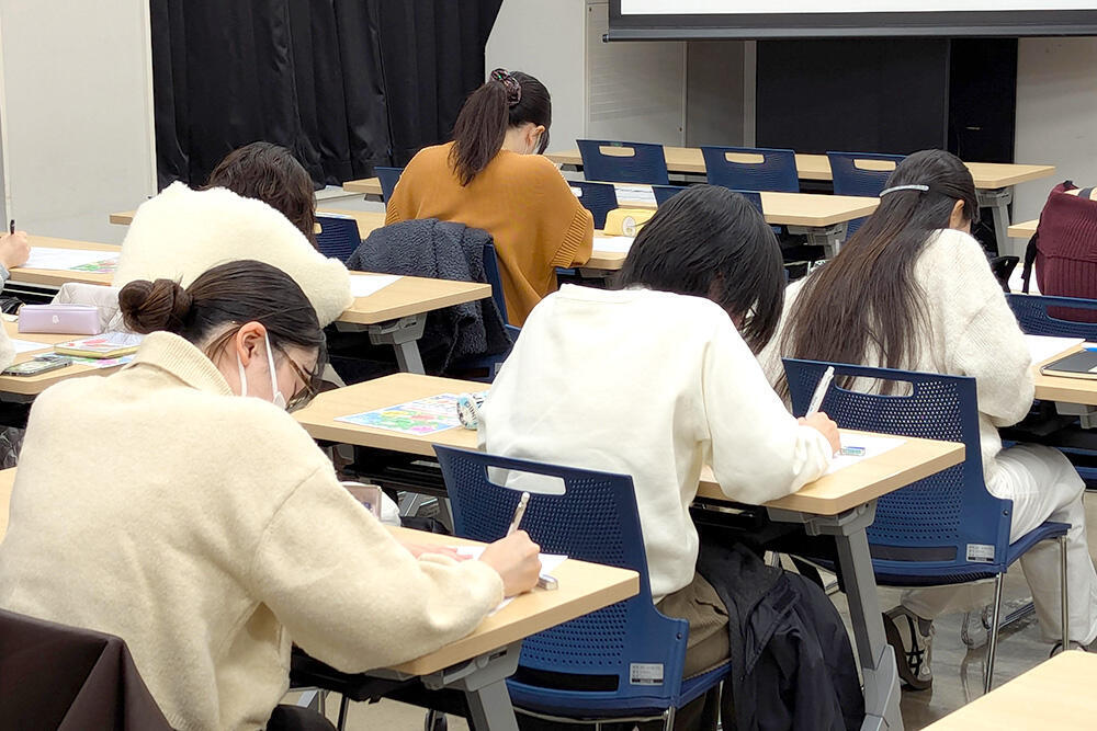学生一人ひとりがエントリーシートに取り組む姿勢は目を見張るものがあり、作成途中に手が止まった学生も、講師やスタッフからのアドバイスを参考にしながら、参加者全員が最後まで集中して書き進めることができました。記入したエントリーシートは講師による添削を受け、後日、本人たちの手元へ返却されます。また、キャリアセンターでも1対1で添削を受けることも可能です。