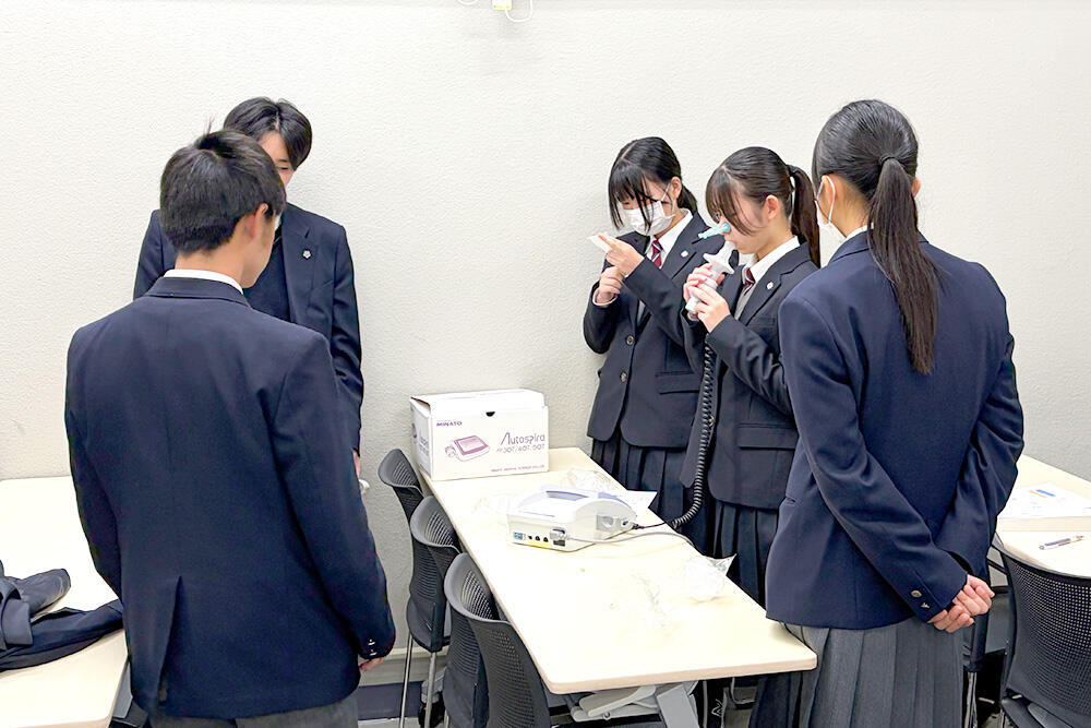 担当の矢野秀典教授から課題についての説明が始まり、続いて体験授業「呼吸機能とリハビリテーション」の一環として、高校生一人ひとりに肺活量を測ってもらいました。