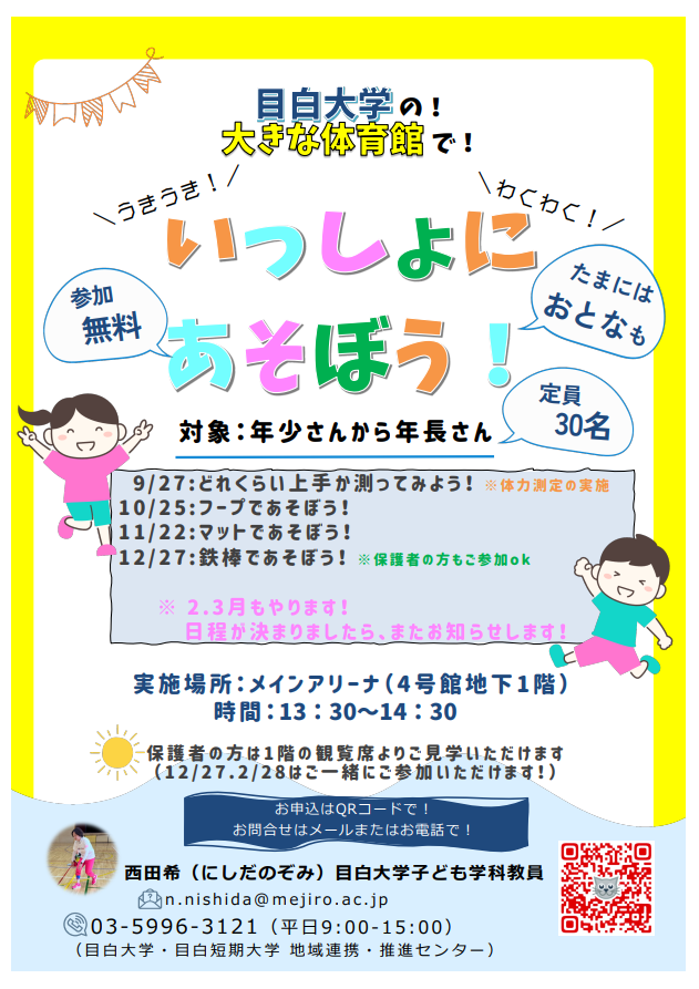 人間学部子ども学科・西田希准教授が、年少~年長のお子さん向けイベント「目白大学の大きな体育館でいっしょにあそぼう!」を開催!