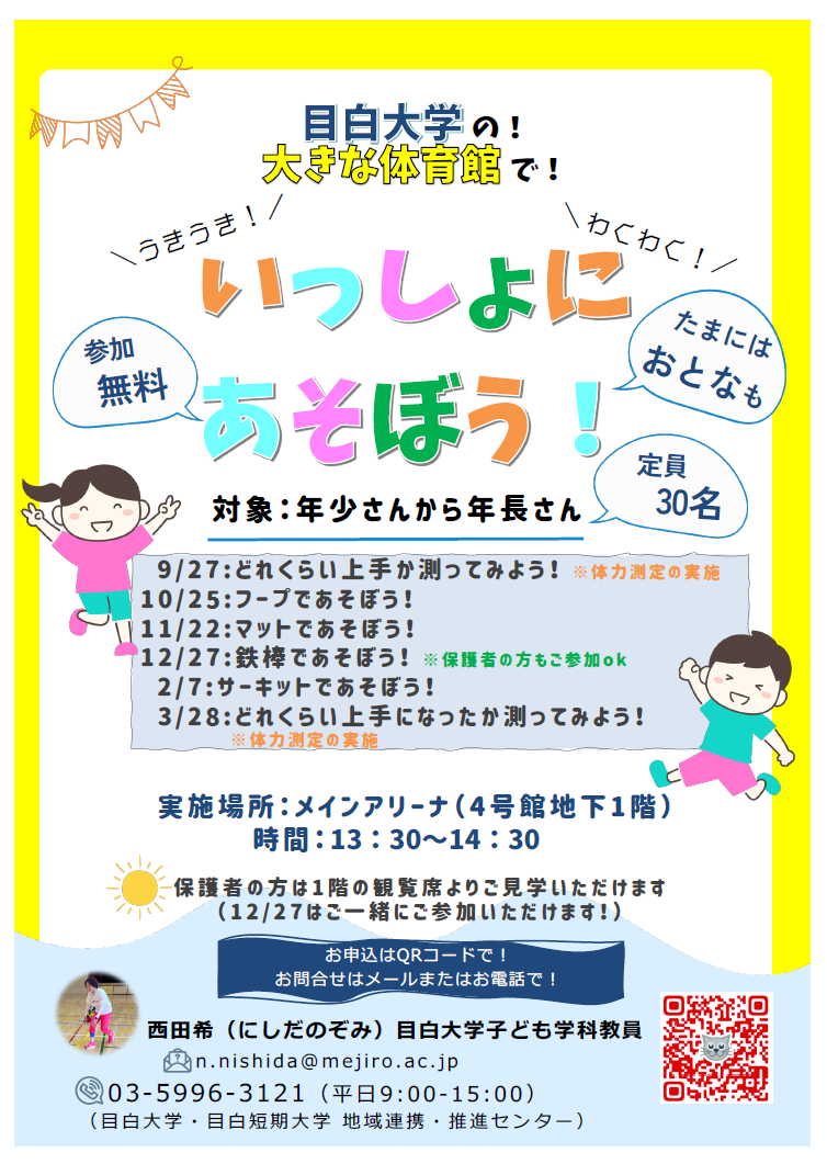 人間学部子ども学科・西田希准教授が、年少~年長のお子さん向けイベント「目白大学の大きな体育館でいっしょにあそぼう!」を開催!