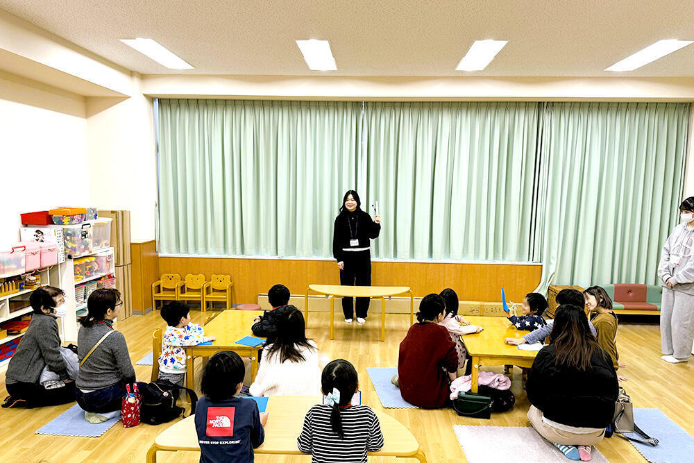 当日は、近隣に住む4歳から6歳の子どもたち8名と保護者10名が参加し、當銘美菜ゼミの学生8名が活動のサポートに加わりました。保護者が見守る中、子どもたちと学生が一緒に活動を楽しみ、笑い声のあふれる温かな交流の場となりました。