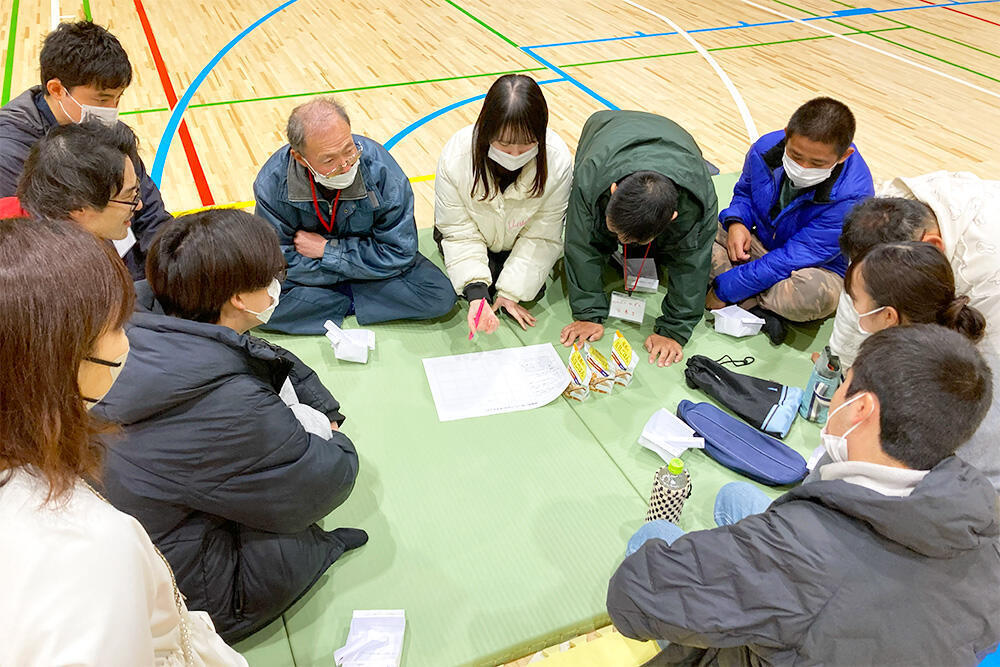 防災ビンゴでは、必要な物を相談しました。また、大学で実際に備えている防災バッグの中身などを紹介しました。グループに分かれて活動する中に教員や学生も一緒に参加し、作業所の利用者へのサポートを学びました。特に、防災ビンゴでは学生たちが中心となって話し合いを進めていました。